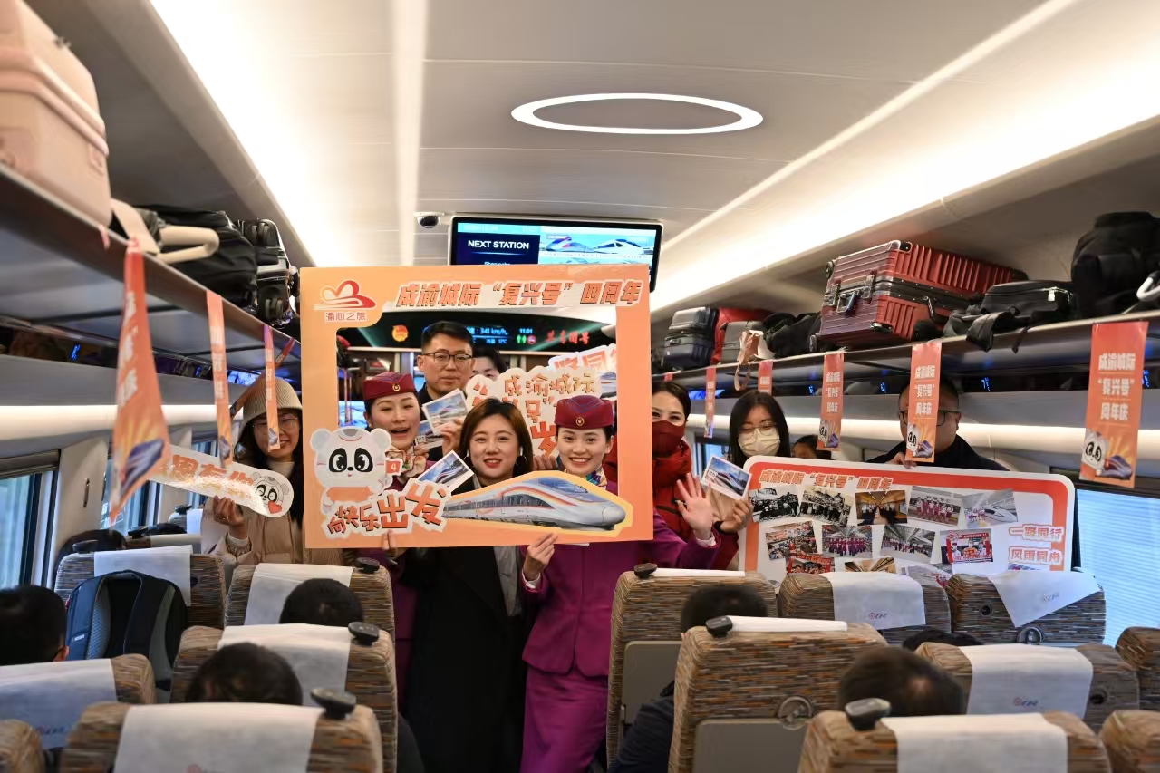 记者从中国铁路成都局集团获悉,2024年12月24日,成渝高铁提速提质运营满四周年。四年前的今天,成渝高铁由时速300公里提速至350公里,成渝间实现高铁公交化运营,两地间的时空距离缩短至62分钟。四年来,成渝高铁日均开行动车组数量从87.5对增加到102对,日均发送旅客数量从2021年的10.6万人次跃升到如今的13.35万人次,开行频次由每20分钟开出一列缩短至平均每5~10分钟开出一列。成渝高铁公交化运营,不仅让“双城生活”成为现实,更推动了区域经济的整体提升,为成渝地区双城经济圈建设注入了强劲动力。