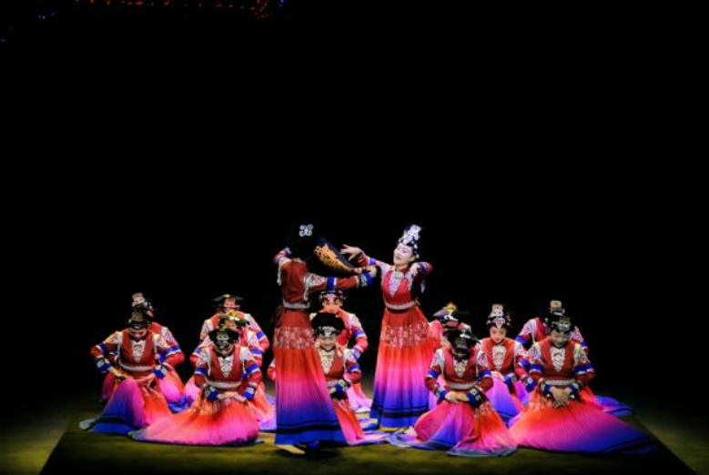 “把云彩一样纯洁的羊毛捻成线,织成衣裙,穿在身上……”随着舞台解说词的娓娓道来,首章《拾艺·云深之处》拉开序幕。彝绣手工技艺活态展演、热烈欢快的舞蹈带给了观众沉浸式的体验。