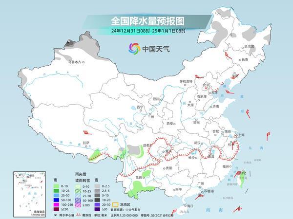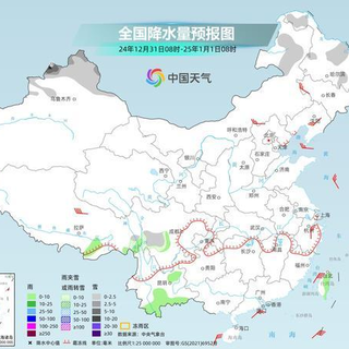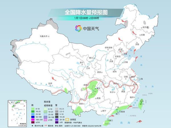 元旦当天,新疆北部和西部山区、川西高原东部、内蒙古东北部、黑龙江中部等地部分地区有小雪或雨夹雪,其中,新疆西部高海拔山区部分地区有中到大雪,局地暴雪。西藏东南部、四川东部、重庆西部、贵州西北部、云南南部、广东南部、海南岛、台湾岛等地部分地区有小雨,其中,台湾岛中部部分地区有中雨。