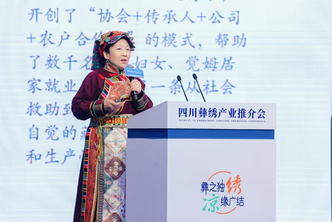 12月31日,杨华珍在12月31日的四川彝绣产业推介会上作了《绣品知识产权保护和转化利用路径》主旨演讲,分享与国际品牌、知名艺术家进行版权合作,探索出非遗产业化发展新路的经验。
