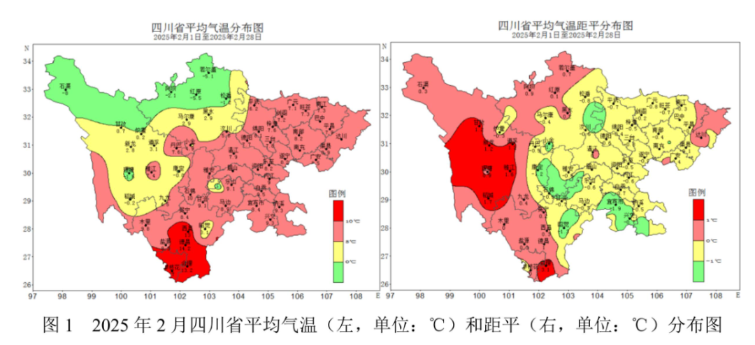 具体来看,2月全省平均气温7.1℃,较常年同期偏低0.4℃。盆地大部平均气温5.0~9.0℃;川西高原北部-8.0~0℃,其余大部0.1~6.0℃;攀西地区大部6.0~15.0℃。攀枝花站17.0℃,全省最高;石渠站-8.0℃,全省最低。与常年同期比较,盆地除盆东北局部偏高外,其余大部偏低0.1~1.5℃:川西高原东部偏低0.1~1.2℃,其余大部偏高0.1~1.5℃;攀西地区东部偏低0.1~1.0℃,其余大部偏高0.1~1.0℃。