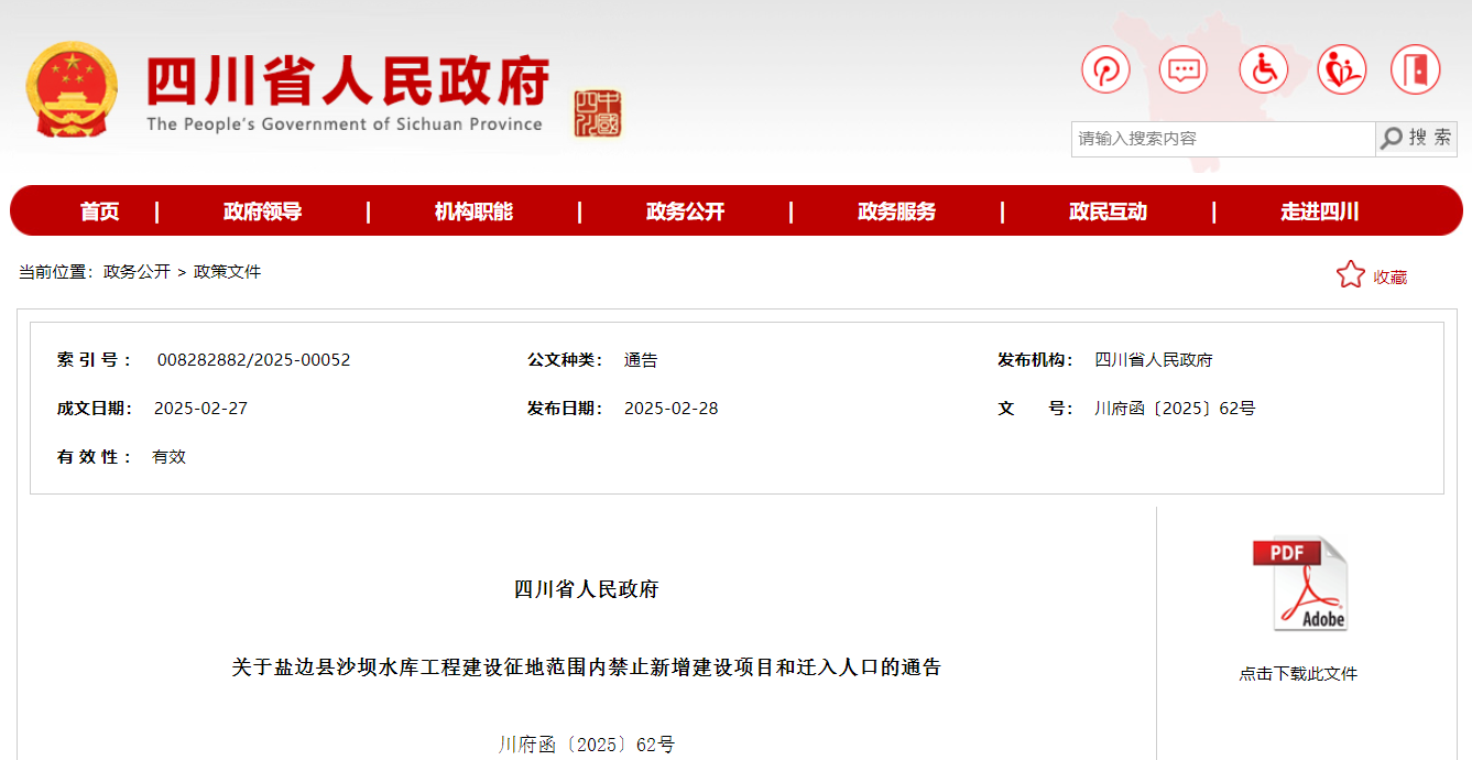 四川发布客户端消息 日前,四川省人民政府发布《关于盐边县沙坝水库工程建设征地范围内禁止新增建设项目和迁入人口的通告》(以下简称《通告》)。