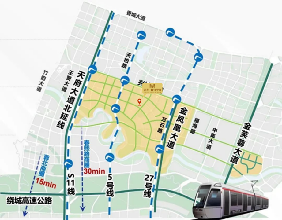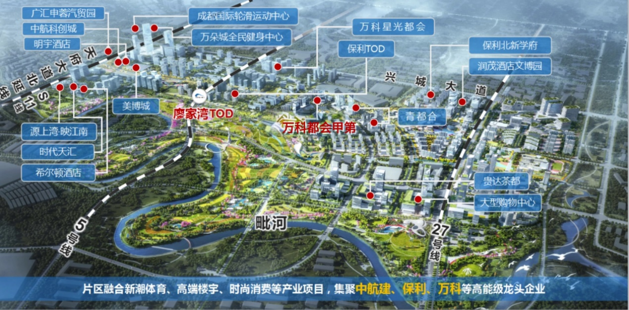 这是成都含“轨”量最高的片区之一:早在2019年,地铁5号线投运,“廖家湾站”开始高频出现在大众视野;2024年12月,地铁27号线一期开通,正式宣告廖家湾进入“双地铁”时代。再加上在建的成德S11线,廖家湾片区5公里范围内就规划有5个轨道站点,30分钟可达天府广场、春熙路商圈等。