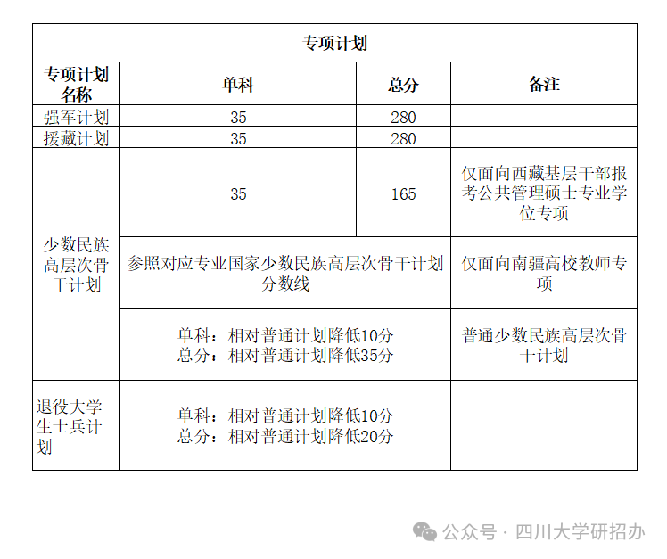 符合条件并申请享受少数民族照顾政策的考生(指工作单位和户籍在国务院公布的民族区域自治地方,且定向就业单位为原单位的少数民族在职人员考生),总分相较报考专业普通计划降10分,单科不变。