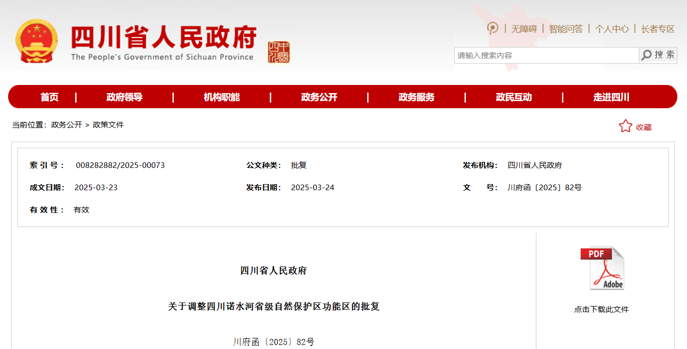 四川发布客户端消息 今日,四川省人民政府发布批复,同意调整四川诺水河省级自然保护区(以下简称自然保护区)功能区。调整后,自然保护区总面积保持不变,核心区面积由21821公顷调减为21745.62公顷,缓冲区面积由10890公顷调减为10867.90公顷,实验区面积由24332公顷调增为24429.48公顷。调整后自然保护区面积、范围和功能区等由省林草局另行发布。