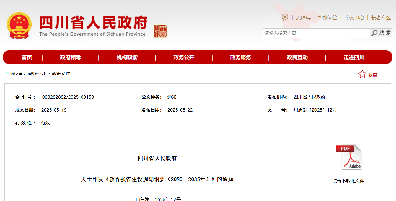 四川发布客户端消息 教育是强国建设、民族复兴之基。日前,省政府印发《教育强省建设规划纲要(2025—2035年)》(以下简称《纲要》),这是我省颁布实施的教育发展纲领性文件,是首个以教育强省为主题、以支撑引领四川现代化建设为重要任务的行动计划,是全面推动各级各类学校高质量发展、推进教育科技人才一体统筹发展、提升政产学研用效能的顶层制度安排,有利于办好人民满意的教育,推进教育高质量发展,支撑引领四川现代化建设。