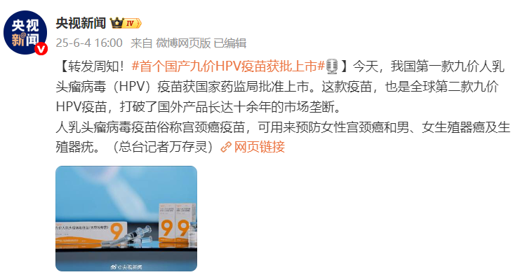 据央视新闻消息,4日,我国第一款九价人乳头瘤病毒(HPV)疫苗获国家药监局批准上市。这款疫苗,也是全球第二款九价HPV疫苗,打破了国外产品长达十余年的市场垄断。人乳头瘤病毒疫苗俗称宫颈癌疫苗,可用来预防女性宫颈癌和男、女生殖器癌及生殖器疣。(记者 万存灵)