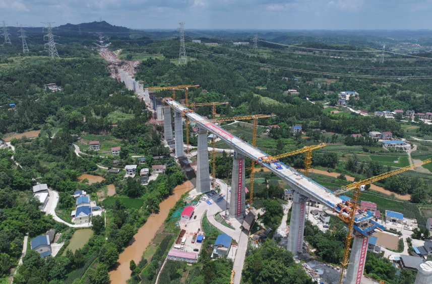 田柳湾特大桥位于四川省资阳市安岳县,桥全长1644.6米,由中铁二院设计,中铁五局承建,桥梁设计墩台39个、箱梁38片。此次合龙的连续刚构梁全长337.4米,结构包含4个主墩和2个边墩,其中21号墩高达79米,该桥为成渝中线高铁全线最高桥,具有技术标准高、施工难度大、安全风险高等特点。