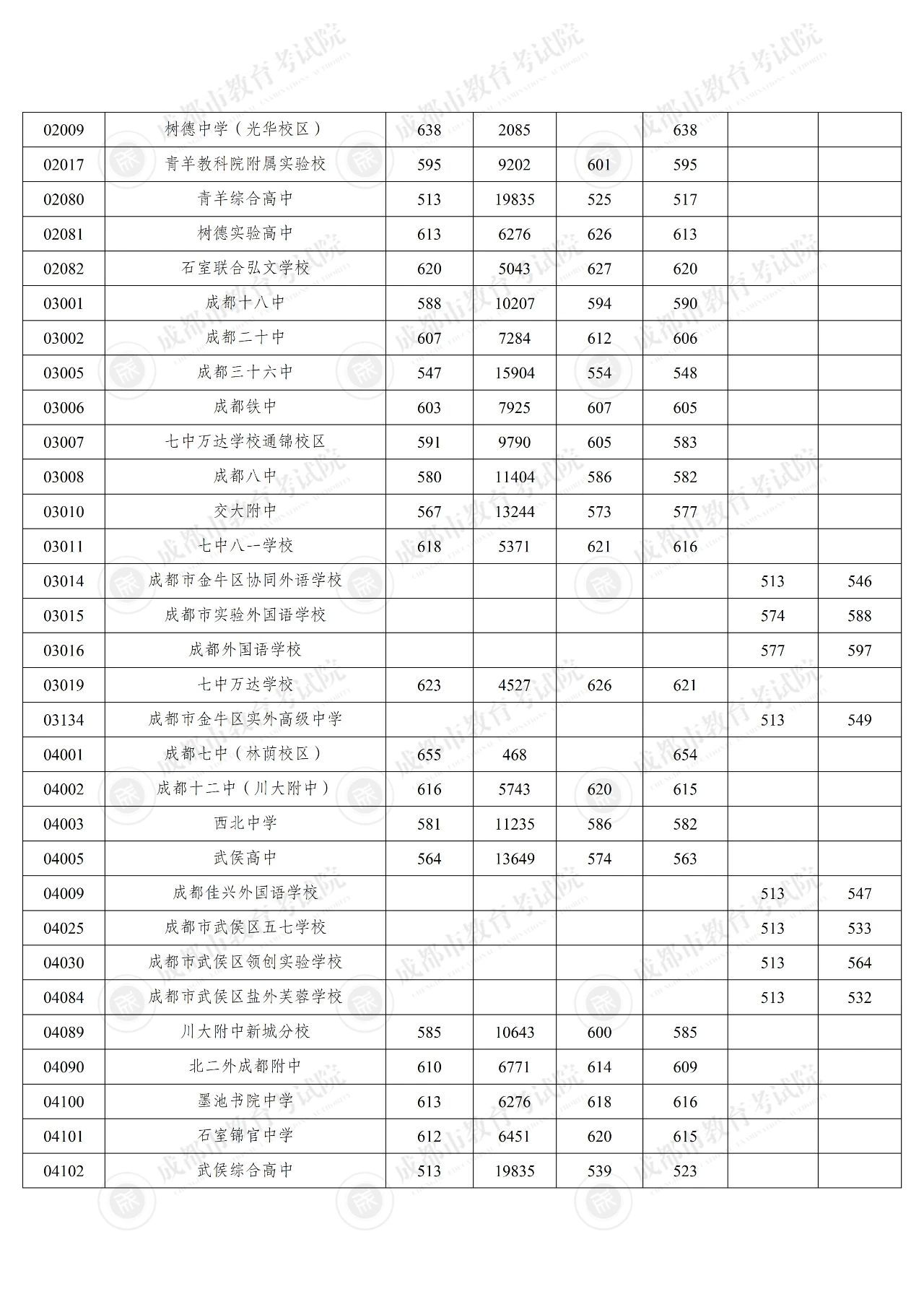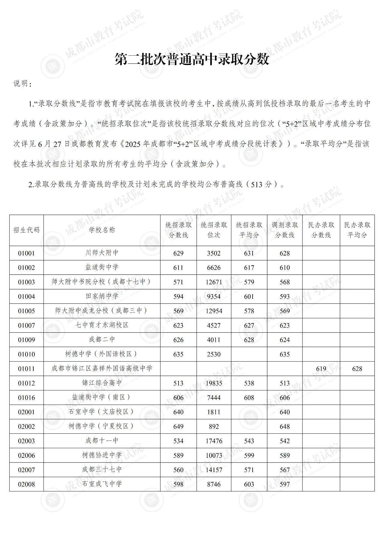 7月7日上午,成都市“5+2”区域进行了中考第二批次〔包括:公办普高(含综合高中)、民办普高、职普融通、中职学校〕录取。市教育考试院按照平行志愿“分数优先、遵循志愿”的投档规则,依据考生志愿和学校招生计划,对中考成绩(含政策加分)在513分(普高线)及以上考生填报的志愿进行了投档录取。“录取分数线”是指市教育考试院在填报该校的考生中,按成绩从高到低投档录取的最后一名考生的中考成绩(含政策加分);“统招录取位次”是指该校统招录取分数线对应的位次(“5+2”区域中考成绩分布位次详见6月27日成都教育发布《2025年成都市“5+2”区域中考成绩分段统计表》);“录取平均分”是指该校在本批次相应计划录取的所有考生的平均分(含政策加分)。本批次共录取19982名考生。各学校录取分数情况一览表附后。录取分数线为普高线的学校及计划未完成的学校均公布普高线。
