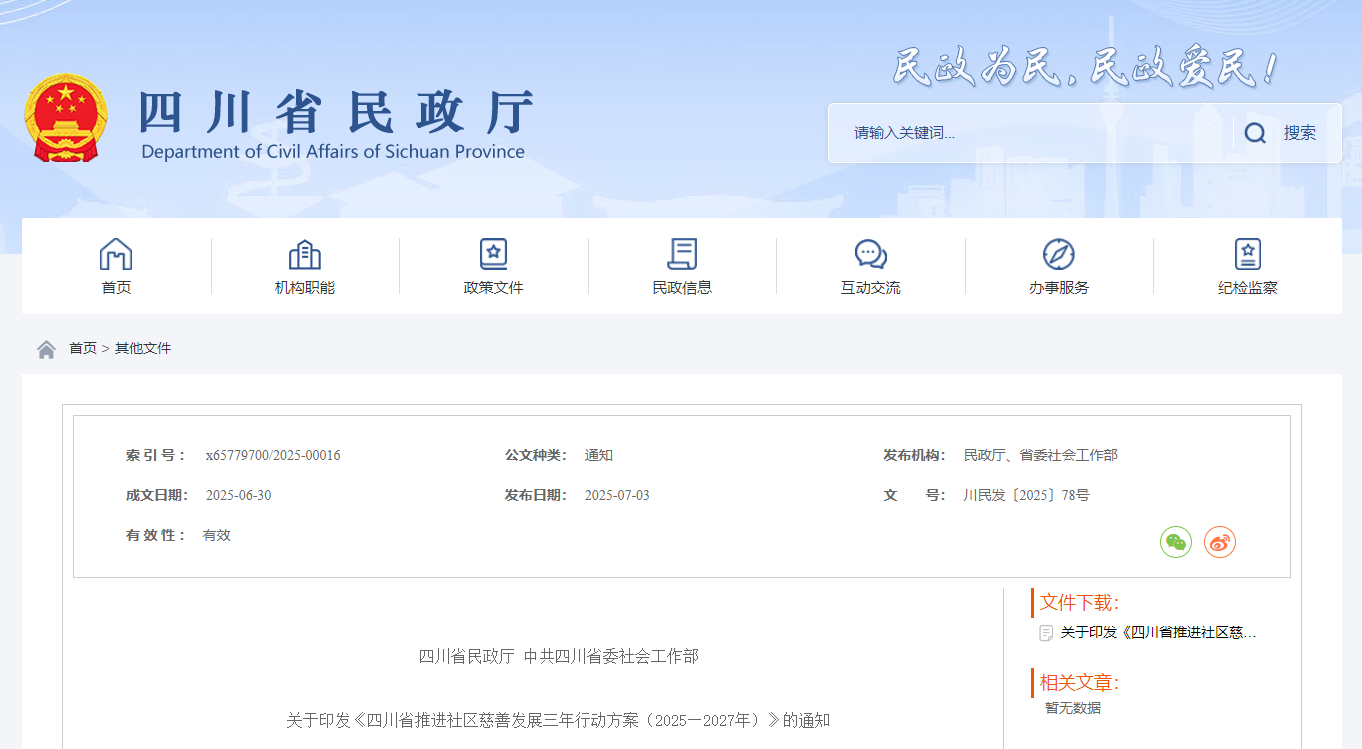 四川发布客户端消息 为进一步发挥慈善助力基本民生保障、基本社会服务、基层社会治理作用,以更好社区慈善推进成效带动全省慈善事业更优发展,日前,四川省民政厅、中共四川省委社会工作部联合印发《四川省推进社区慈善发展三年行动方案(2025—2027年)》(以下简称《行动方案》)。