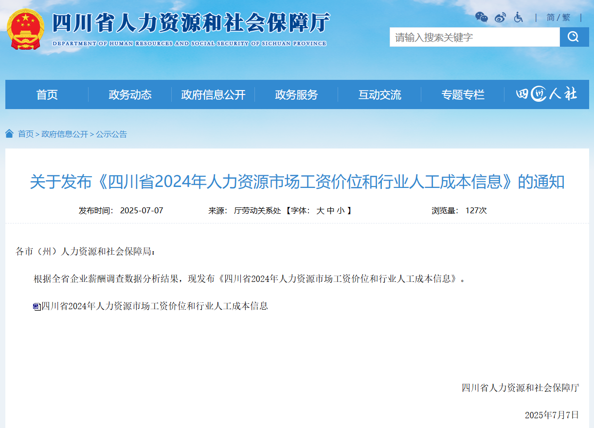 四川发布客户端消息 7月7日,四川省人力资源和社会保障厅发布《四川省2024年人力资源市场工资价位和行业人工成本信息》。