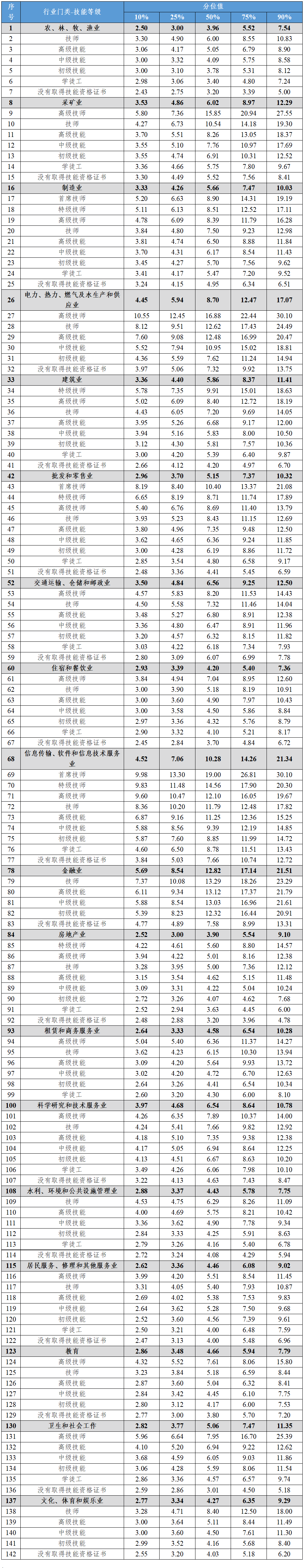 (一)分行业门类不同技能等级的工资价位(2024年)