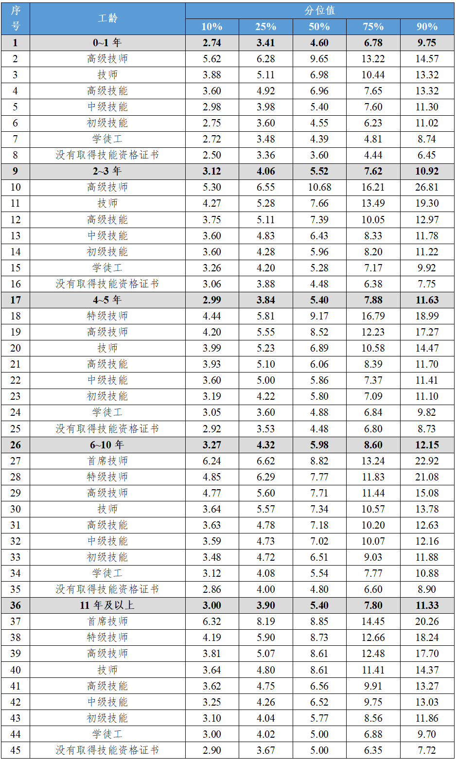 (三)分工龄不同技能等级的工资价位(2024年)