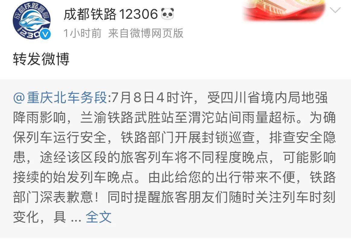 铁路部门同时提醒旅客朋友们关注列车时刻变化,具体情况详见站内公告、成都铁路12306微博或拨打(028)12306铁路客服中心电话咨询,及时掌握最新的列车运行资讯,合理安排行程。
