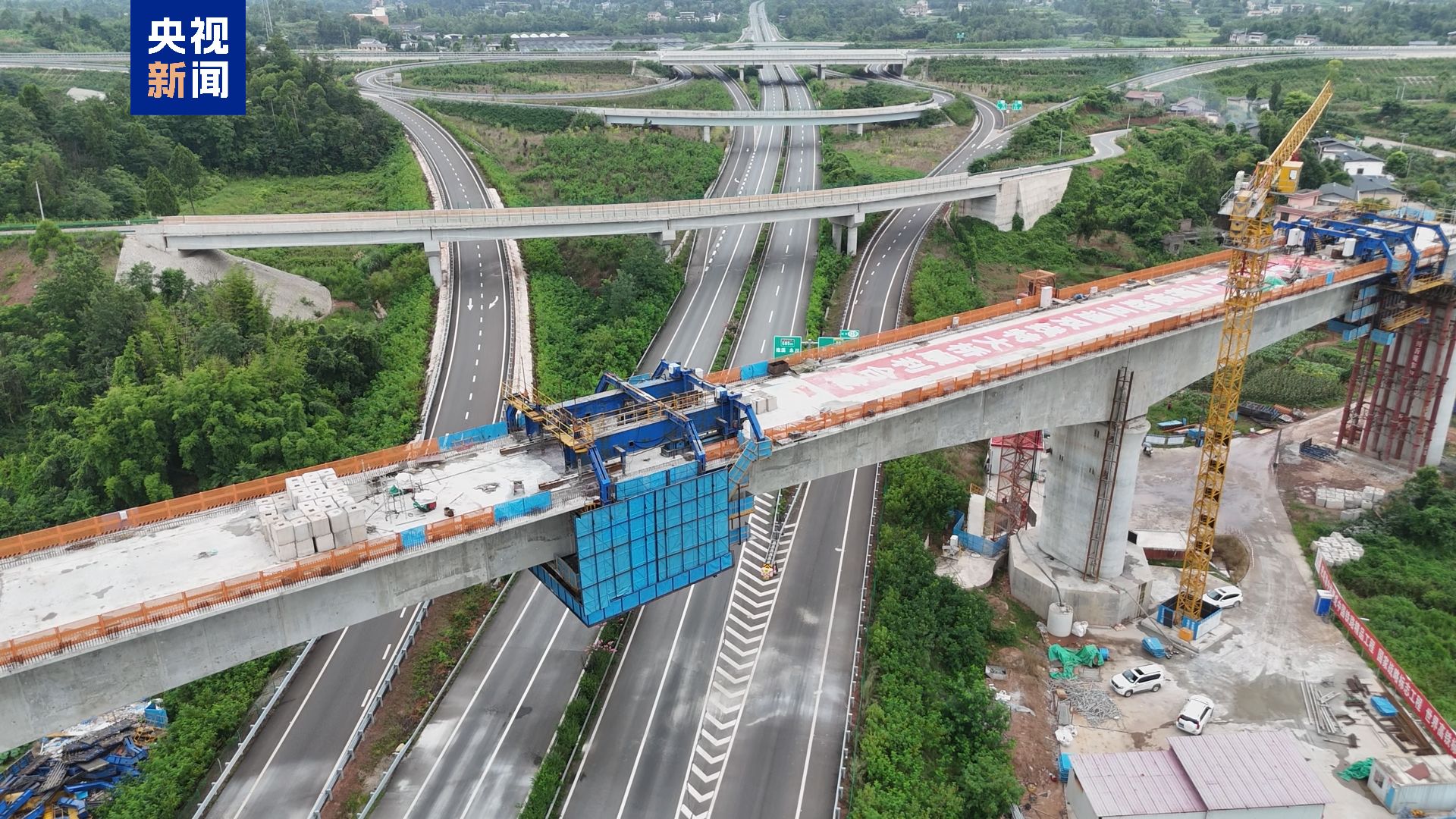 土桥枢纽互通双线特大桥全长3271.6米,上跨重庆三环高速及铜安高速公路,共设有92个桥墩,2个桥台。此次合龙的连续梁,全长约242米,成功跨越重庆三环高速公路,为成渝中线重庆段跨度最大连续梁。施工过程中,施工方中铁五局在此前使用的4米智能悬臂造桥机基础上,进一步优化设计,应用了6米智能悬臂造桥机,该造桥机单次浇筑节段更长,安装、拆除更为便捷,结构更加安全稳定,较传统挂篮4米节段施工,综合工效提升30%以上。同时,应用了造桥机信息化监测、自动行走、模板自动开合、自动喷淋养护等智能化设备,显著提升了连续梁智能建造水平。