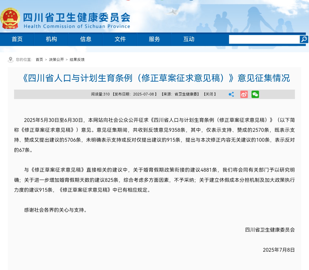 四川发布客户端消息 记者从省卫生健康委获悉,《四川省人口与计划生育条例(修正草案征求意见稿)》(以下简称《修正草案征求意见稿》)公开征求意见情况已在省卫生健康委官网公布。
