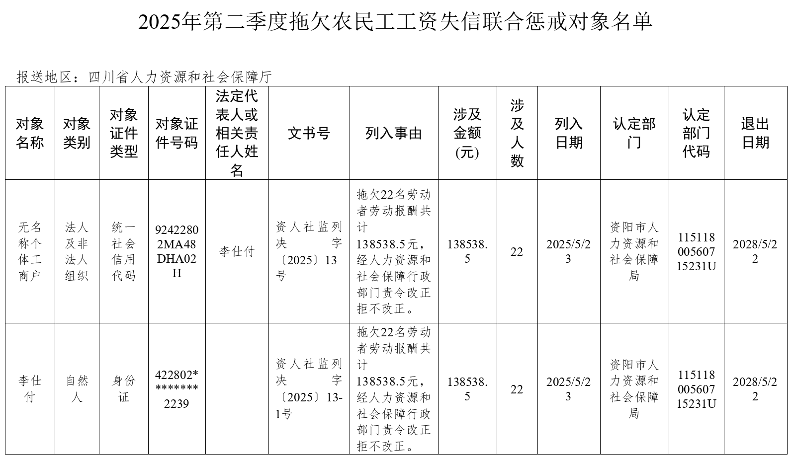 四川发布客户端消息 为加大对重大劳动保障违法行为的惩戒力度,强化对用人单位守法诚信的社会监督,7月8日,四川省人力资源和社会保障厅向社会公布我省2025年第二季度重大劳动保障违法行为及拖欠农民工工资失信联合惩戒对象名单。