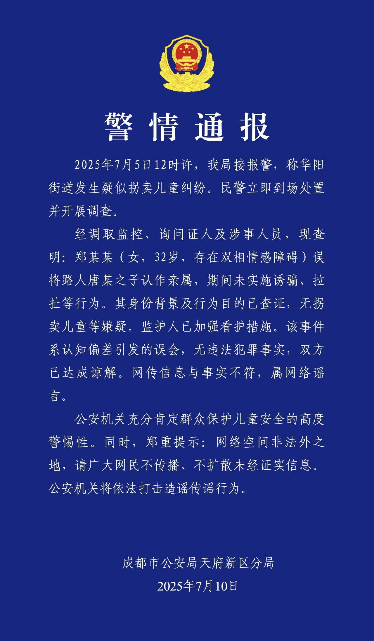 2025年7月10日,成都市公安局天府新区分局发布警情通报: