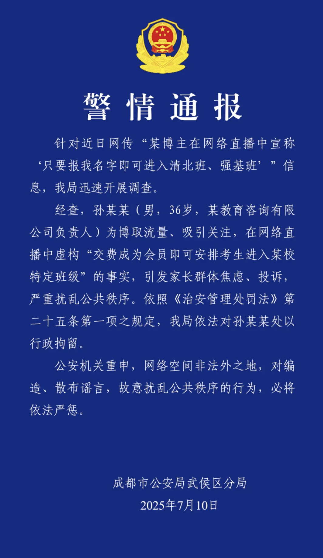 为维护学校正常的招生秩序,落实阳光招生要求,北二外成都附中已就“孙老师”的不实行为向簇锦派出所报案。7月10日,成都市公安局武侯区分局发布警情通报,详情如下: