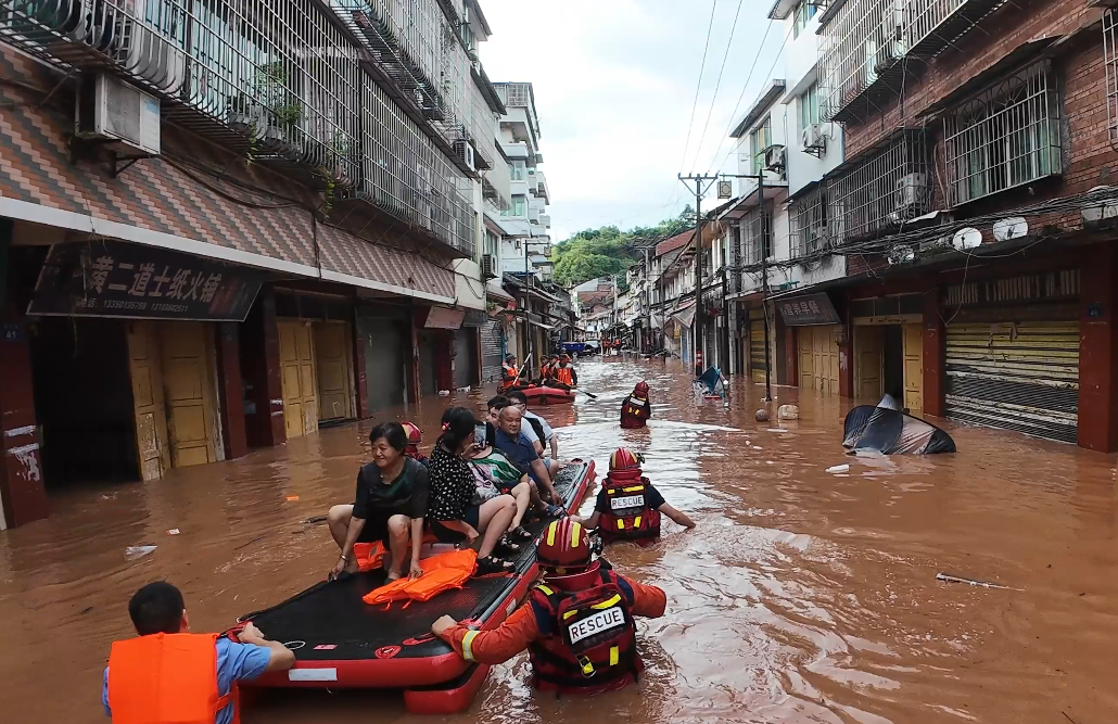 在合江县福宝镇,强降雨同样给当地群众带来安全威胁。为尽快转移受困群众,武警、消防、公安民警等多支专业救援队伍紧密协同,携带橡皮艇、救生衣等专业救援装备,涉水深入受困区域。救援人员在积水中小心前行,逐户排查被困情况,安全有序地将群众转移至安全地带。