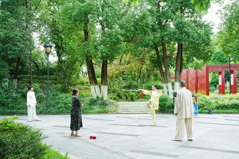 “这个手要再抬一点,步子再大一点。”7月10日一大早,今年66岁的简春就已经和3个伙伴来到泸县九曲河公园川江家风馆外的广场上,练起了太极剑,一招一式很有章法。“我们基本每天7点就来这练剑打拳,这边环境好,各种便民设备也很齐全,累了还可以去家风馆里逛逛。”简春笑着告诉记者。