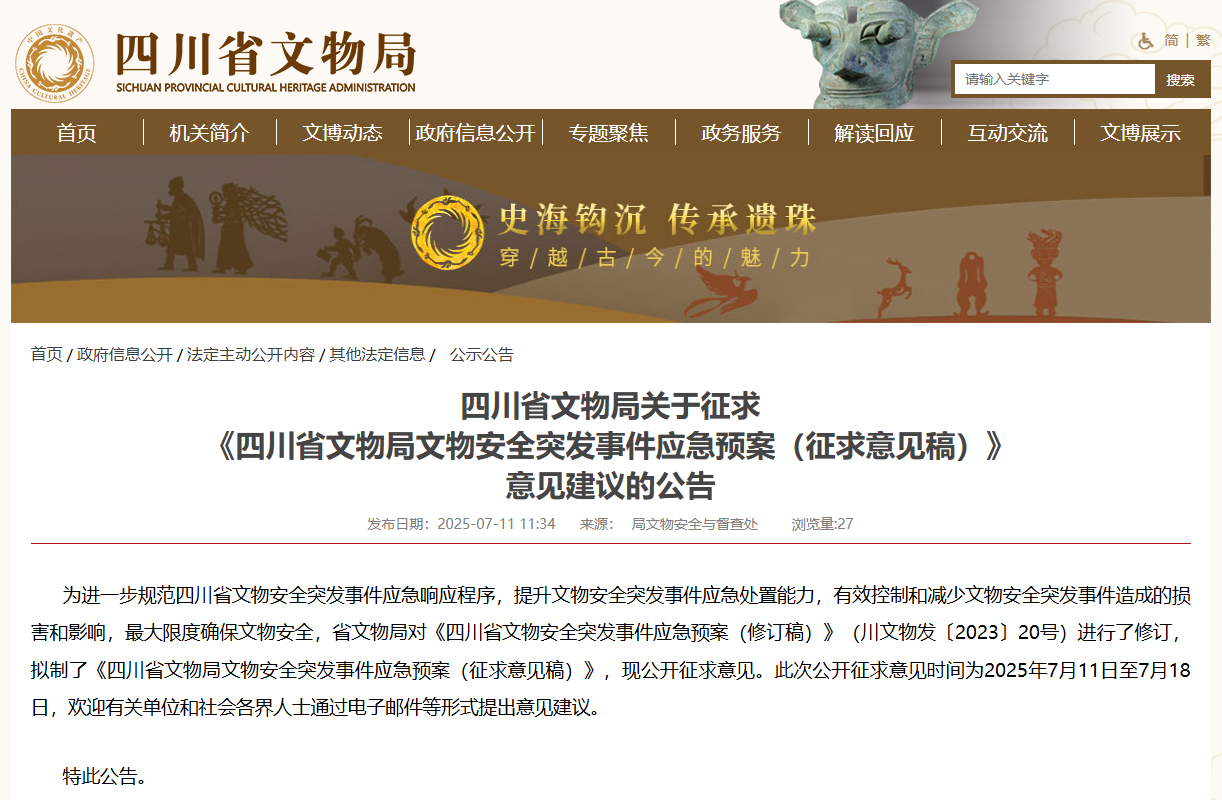 四川发布客户端消息 7月11日,四川省文物局发布公告,征求《四川省文物局文物安全突发事件应急预案(征求意见稿)》(以下简称《征求意见稿》)意见建议,进一步规范四川省文物安全突发事件应急响应程序,提升文物安全突发事件应急处置能力,有效控制和减少文物安全突发事件造成的损害和影响,最大限度确保文物安全。