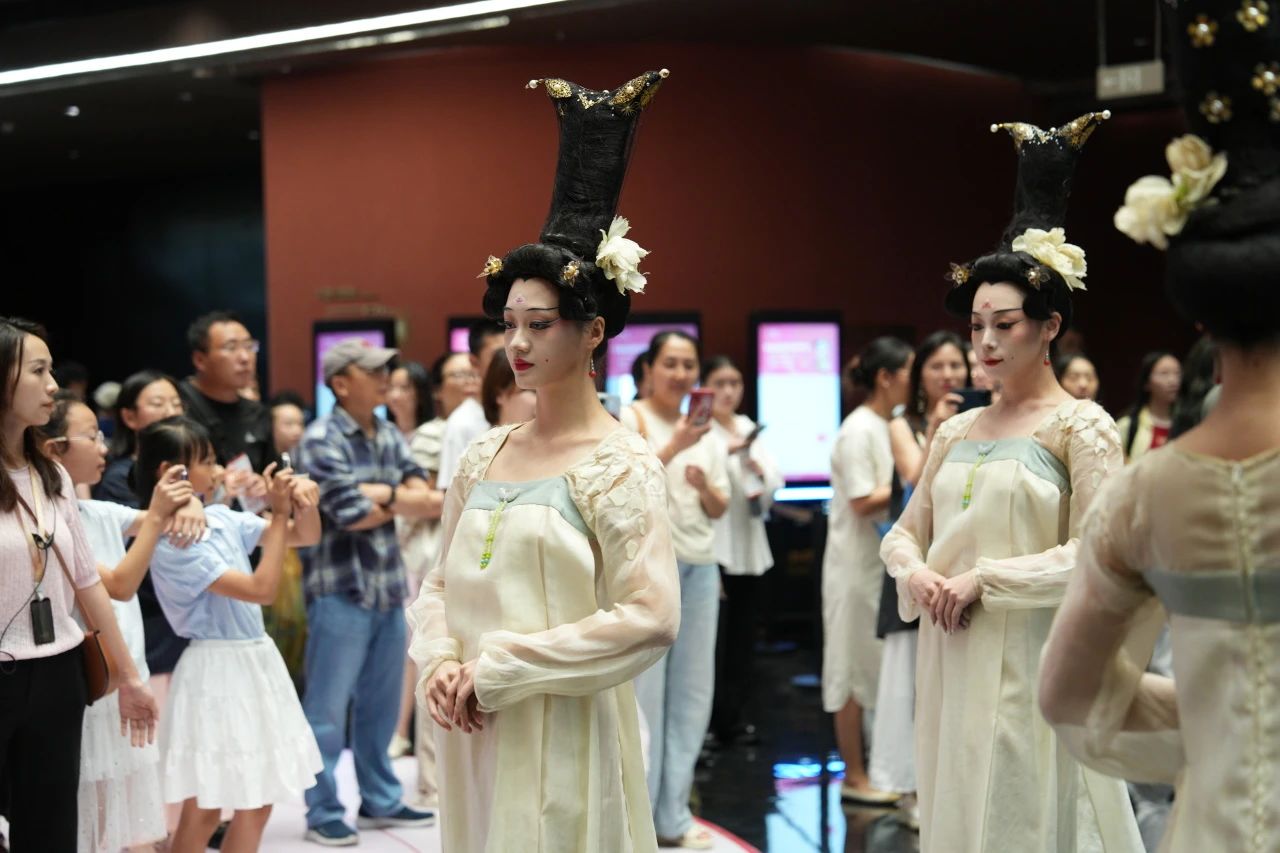 此次《杜甫》回蓉,还在东安湖大剧院特别为观众带来“演员巡游”。在演出开场前,舞者们以富有汉唐特色的舞姿与体态,搭配华丽的宫廷服饰,在剧院内现场巡游,观众得以沉浸体验“东安湖畔多丽人”的盛世风华。一些观众,也精心穿着汉服,遥相呼应。