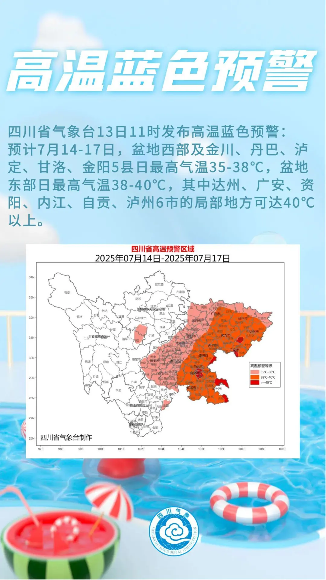 据@四川气象 发布的高温蓝色预警:预计7月14-17日,盆地西部及金川、丹巴、泸定、甘洛、金阳5县日最高气温35-38℃,盆地东部日最高气温38-40℃,其中达州、广安、资阳、内江、自贡、泸州6市的局部地方可达40℃以上。