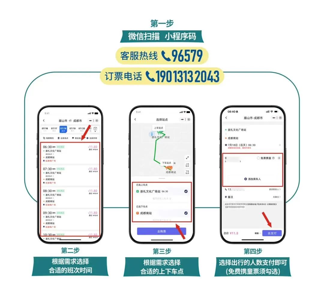 眉山⇌成都便民快巴线路车票采用预约制,1人1座,需先在小程序上购买车票后方可乘车,请广大乘客朋友们,先买票后乘车,直接去站台候车,可能出现无法乘车的情况。