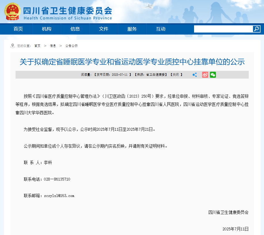 按照相关要求,经单位申报、材料审核、专家论证、竞选答辩等程序,根据竞选结果,拟确定四川省睡眠医学专业医疗质量控制中心挂靠四川省人民医院,四川省运动医学医疗质量控制中心挂靠四川大学华西医院,公示时间2025年7月11日至2025年7月21日。