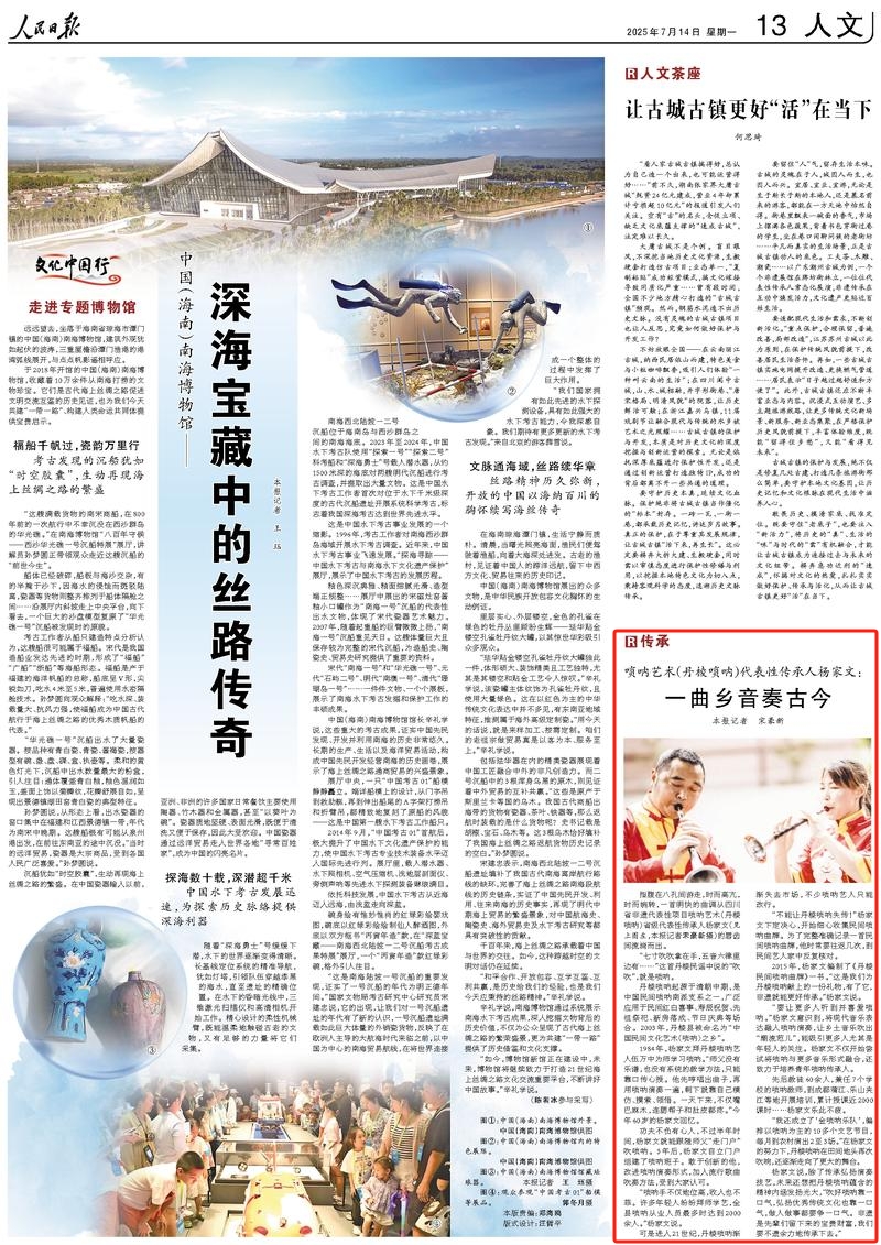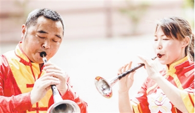指腹在八孔间游走,时而高亢,时而婉转,一首明快的曲调从四川省非遗代表性项目唢呐艺术(丹棱唢呐)省级代表性传承人杨家文(见图左,人民日报记者宋豪新摄)的唇齿间流淌而出。