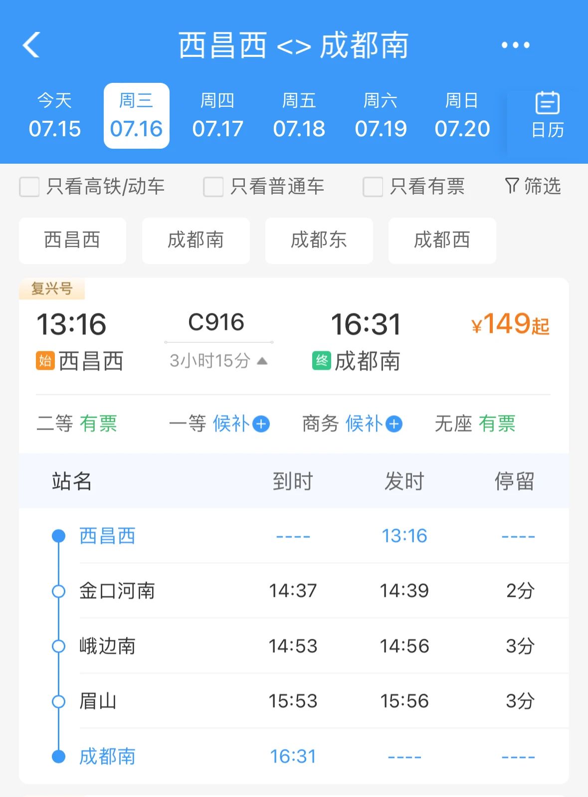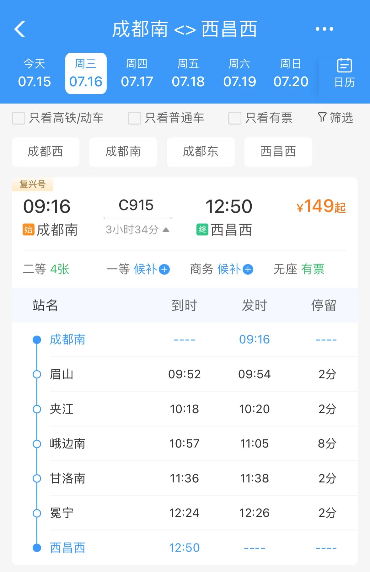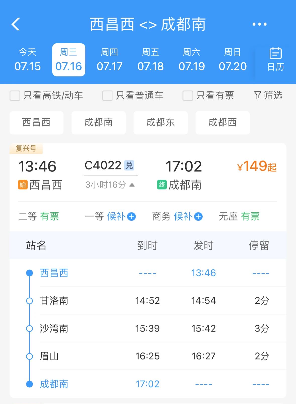 二等座全程票价149元