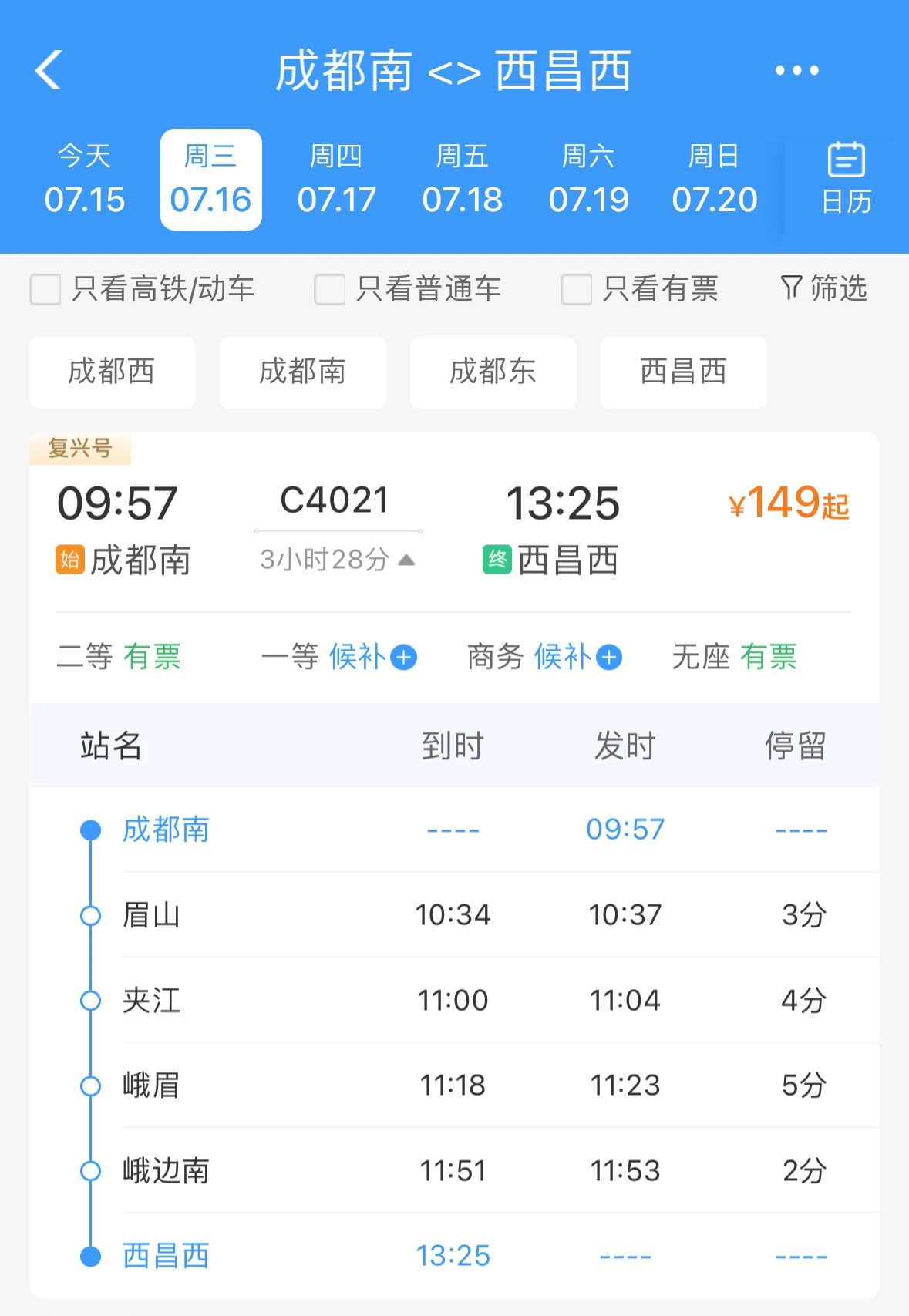 途经西昌西、峨边南、夹江、眉山等车站