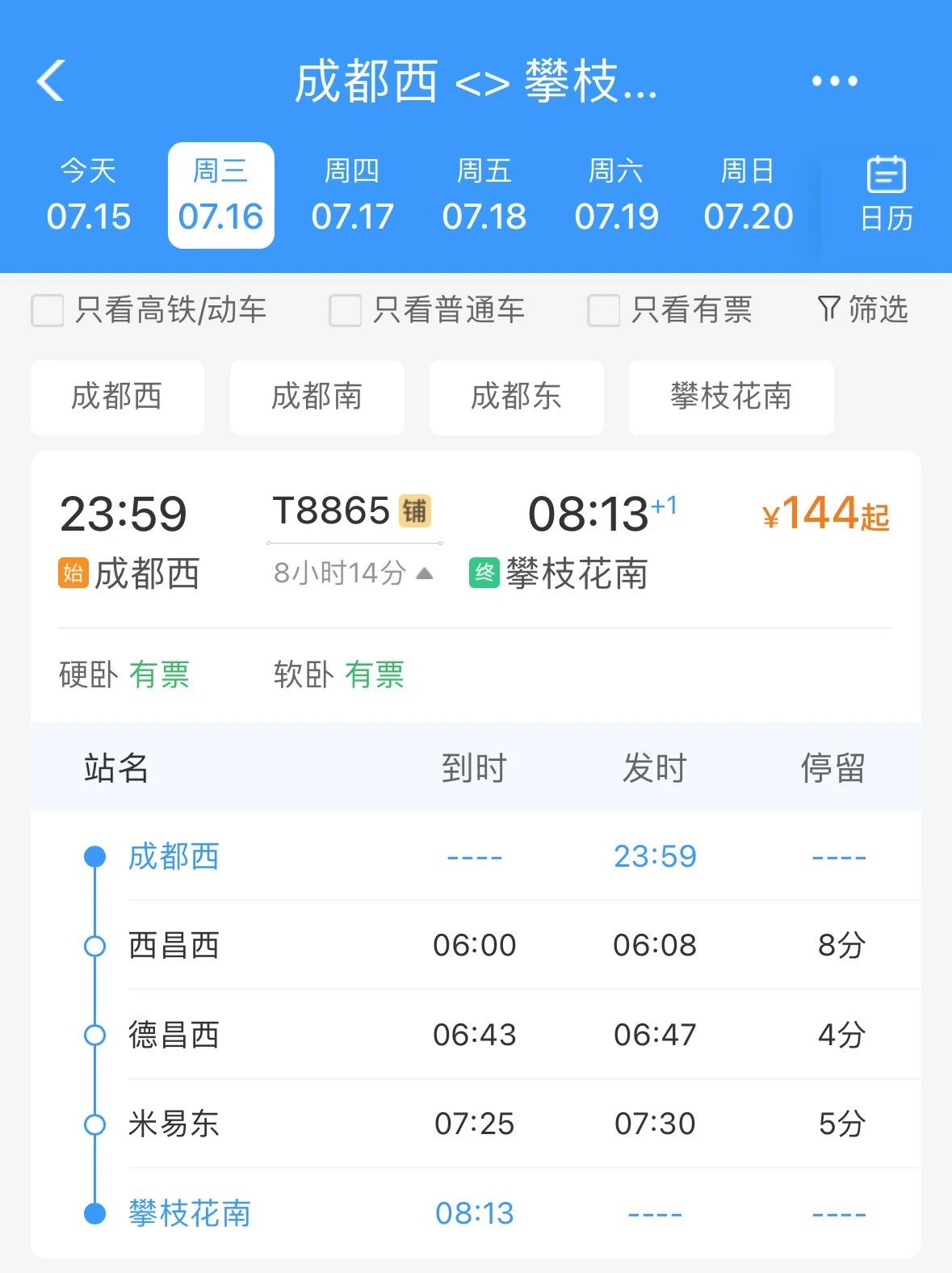硬卧全程票价最低144元起