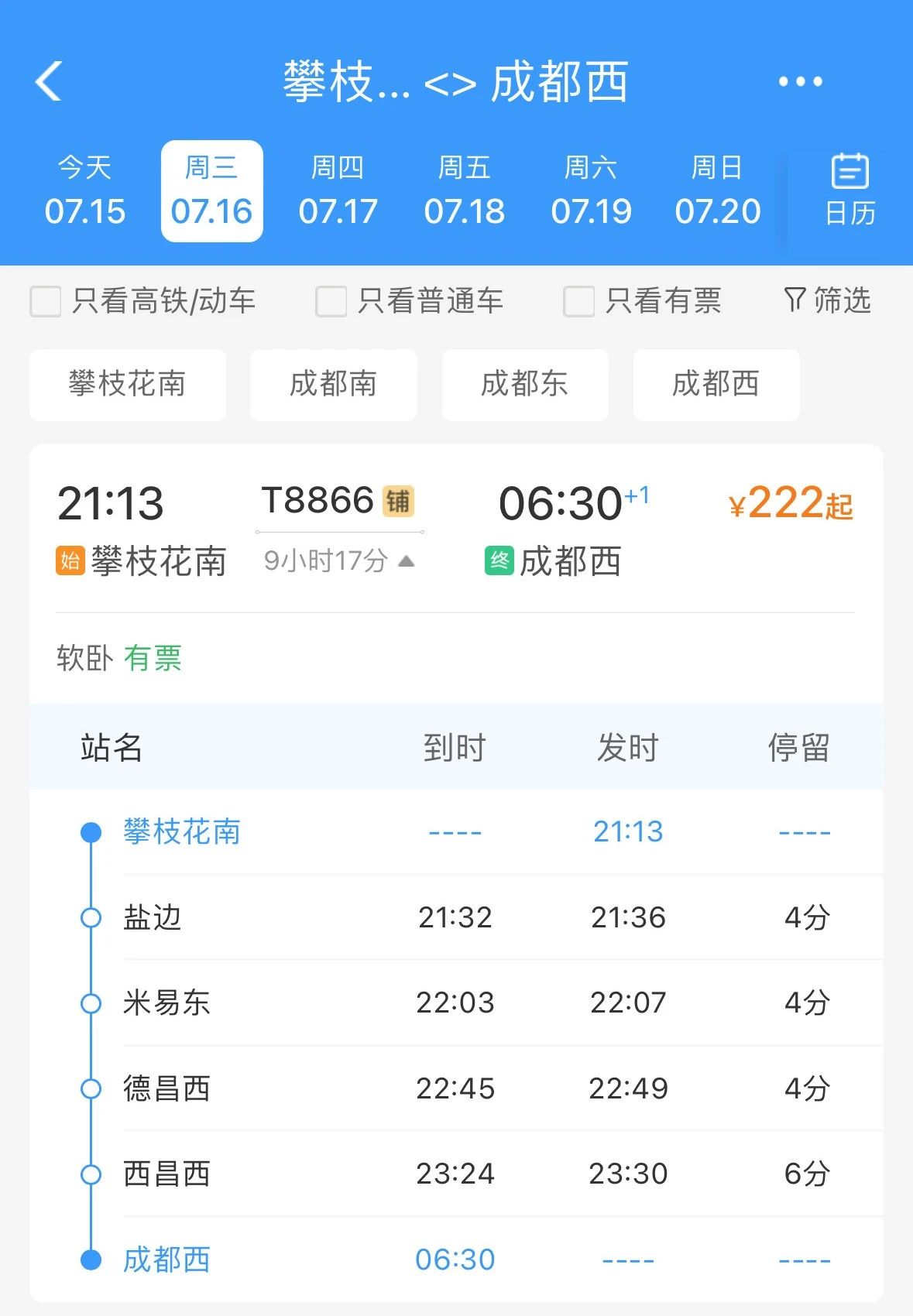 软卧全程票价最低222元起