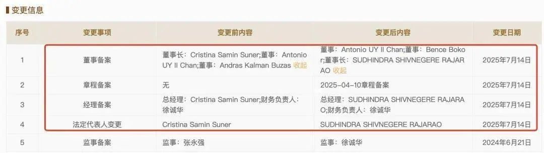 Cristina Samin Suner已卸任公司法定代表人、董事长及总经理职务。上述核心职位由Sudhindra Shivnegere Rajarao接任。同时,公司部分董事发生变更,Antonio UY II Chan的职务由Bence Bokor接替。