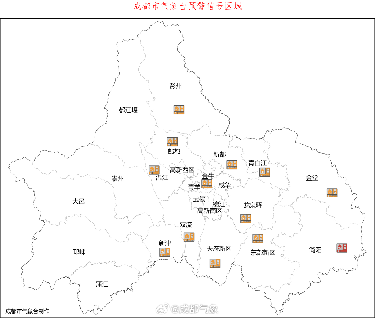 预计成都市武侯区、锦江区、青羊区、成华区、金牛区、高新南区、高新西区和青白江区的所有镇(街道)今日最高气温将升至35℃以上,成都东部新区的大部分镇(街道)今日最高气温将升至38℃以上,高温时段主要出现在12-17时。目前成都市简阳发布高温红色预警信号,彭州、郫都、温江、新津、双流、新都、龙泉驿、金堂和四川天府新区发布高温橙色预警信号。