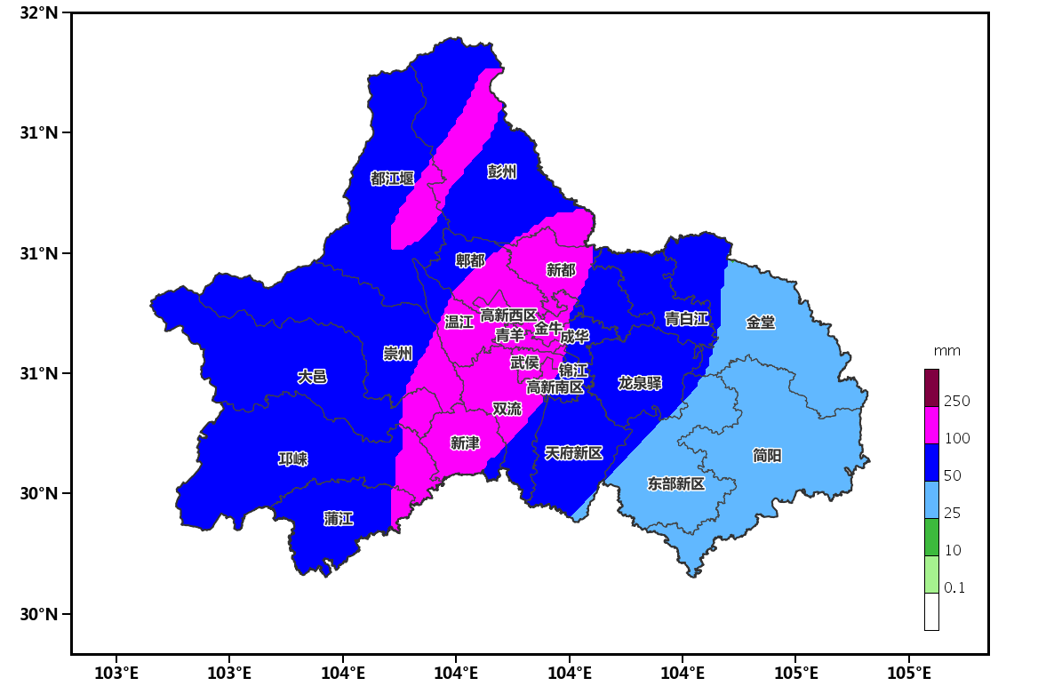 预计18日白天到19日白天成都市有阵雨或雷雨,雨量大雨到暴雨(40~90毫米),青羊区、武侯区、金牛区、高新西区、高新南区、新都、温江、郫都、新津、双流、崇州、彭州和都江堰的部分地方大暴雨(110~150毫米,个别地方可达200毫米),最大小时雨量60~80毫米,雷雨时伴有短时强降雨和阵性大风等强对流天气。请注意防范。伴随此次降雨天气过程,高温结束。