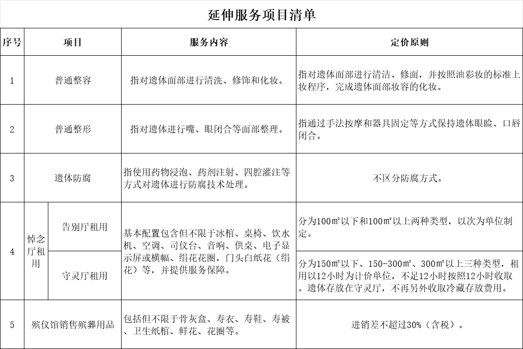 延伸服务收费。指在基本服务以外、供群众自主选择的其他服务收费,包括普通整容、普通整形、遗体防腐、悼念厅租用、殡葬用品五项,属于经营服务性收费,实行政府指导价,其中殡葬用品实行进销差率管理,最高不超过30%。