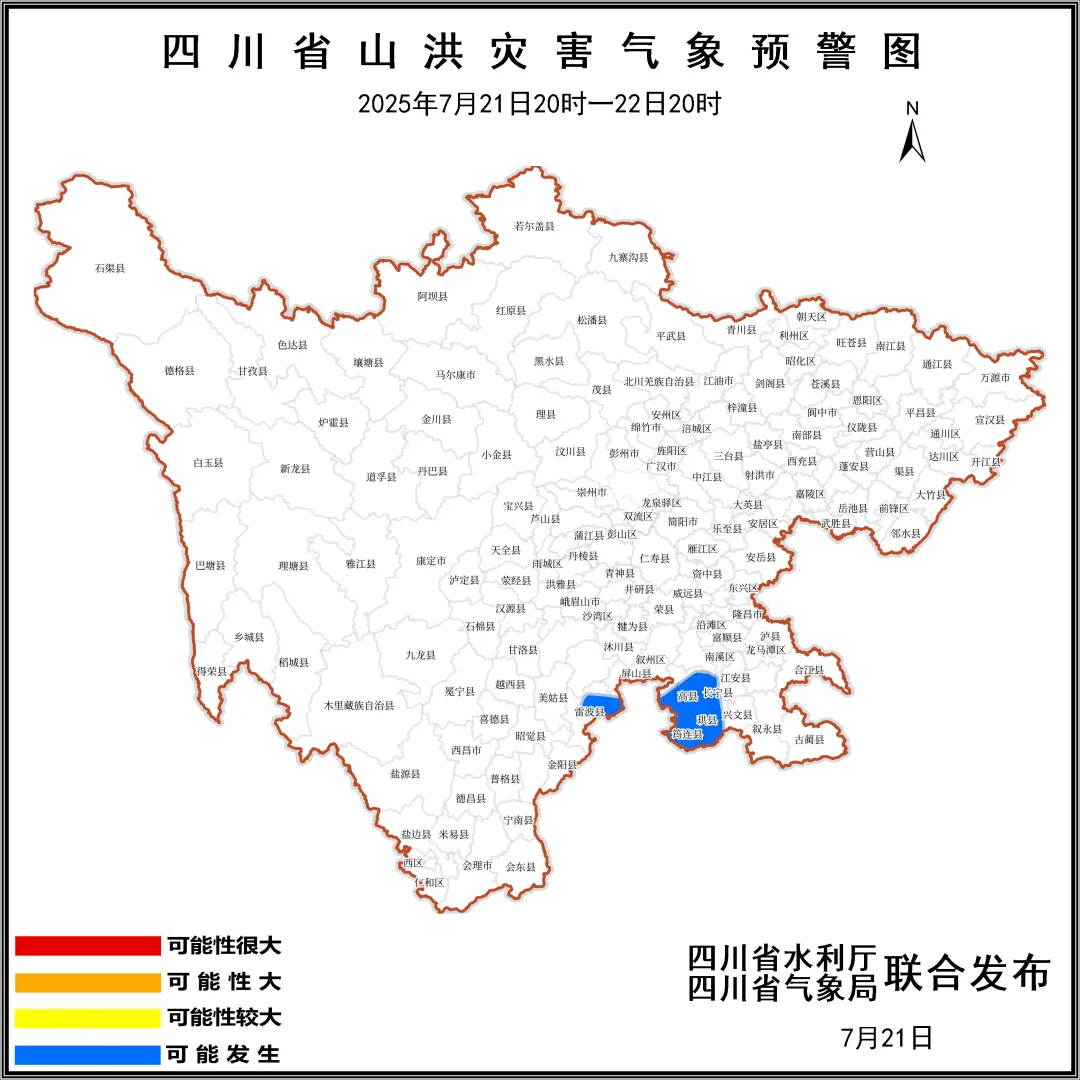 四川省水利厅发布山洪灾害蓝色预警:2025年7月21日20时至22日20时,宜宾市珙县、筠连、长宁、高县、兴文、翠屏、叙州,凉山州雷波等8个县(市、区)可能发生山洪灾害。