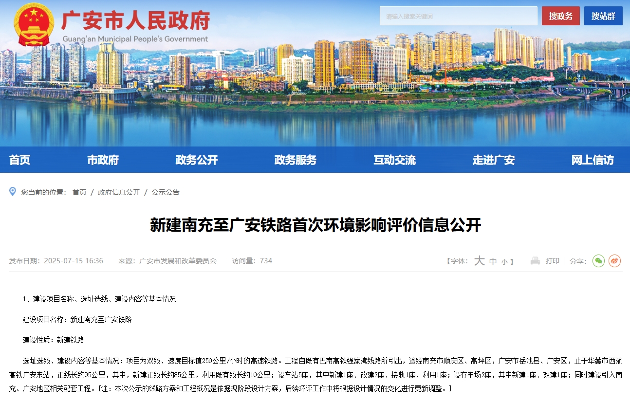 近日,广安市人民政府官网发布《新建南充至广安铁路首次环境影响评价信息公开》,这意味着,这条串联川东腹地的高铁动脉,向实质性建设阶段又迈进一步。