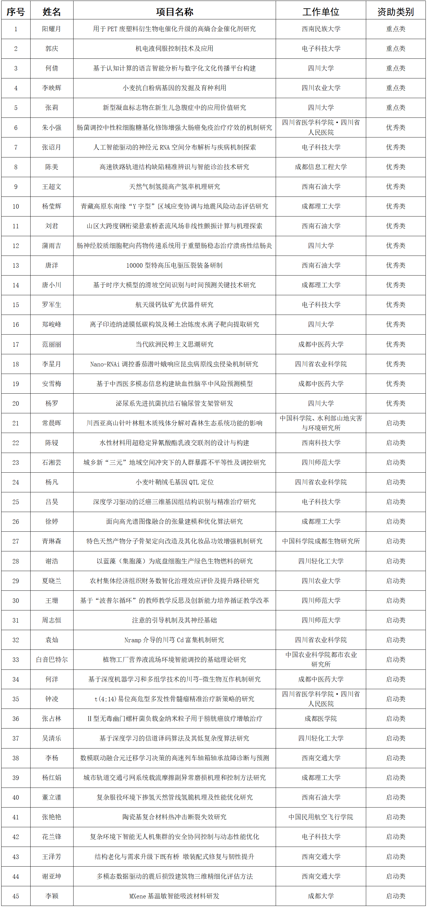 (一)2025年度四川省留学回国人员科技活动项目择优资助拟资助项目