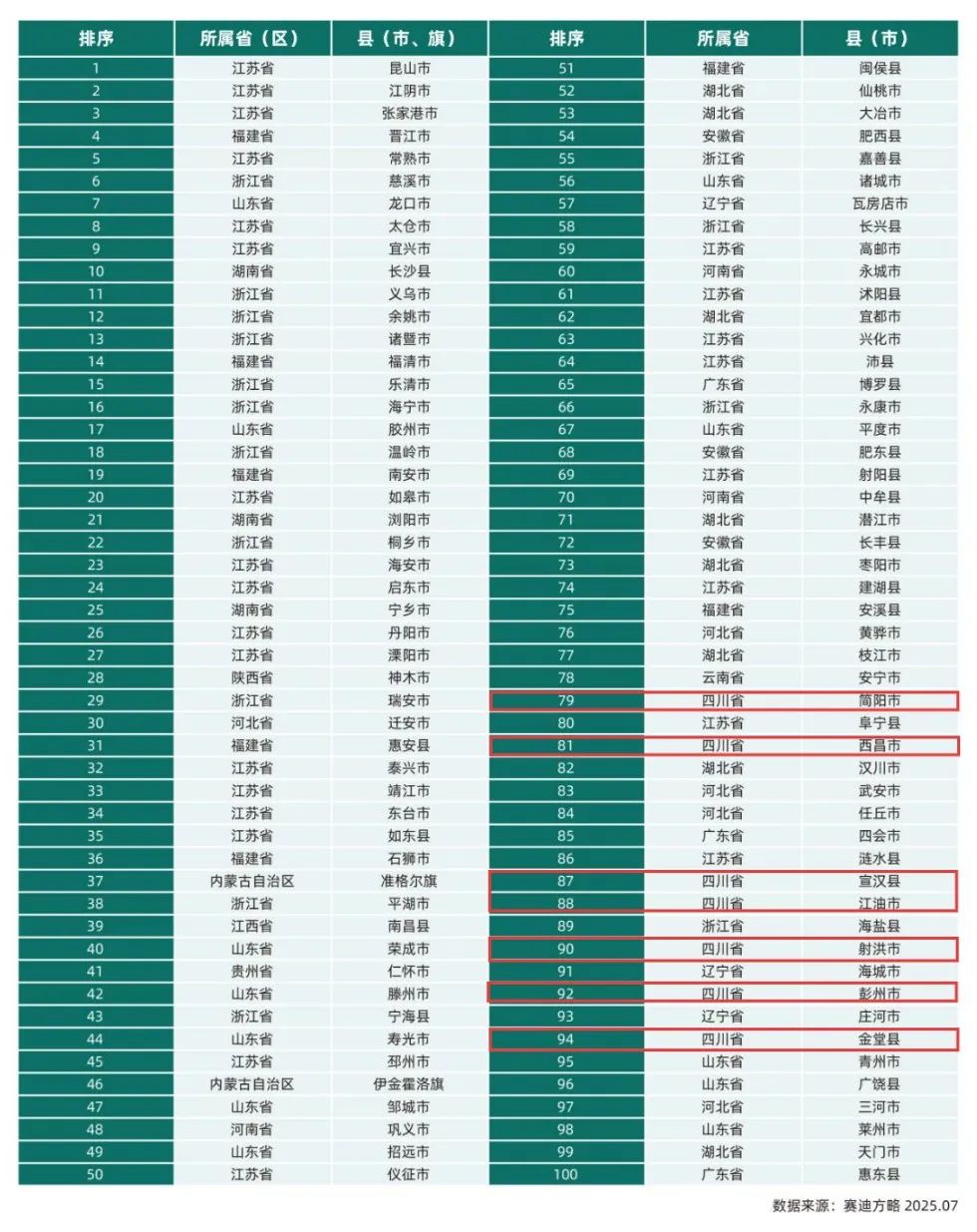 四川共有7个县(市)上榜