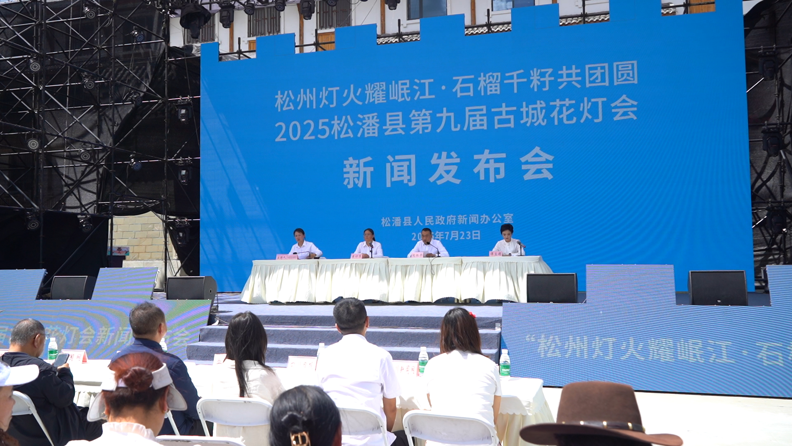 四川发布客户端消息 7月23日,“松州灯火耀岷江·石榴千籽共团圆”松潘县第九届古城花灯会新闻发布会在松潘县民族广场召开,中共松潘县委常委、宣传部部长袁付翠,中共松潘县委常委、县政府副县长刘红平,松潘县文化广播电视体育和旅游局局长谭立娟等参加新闻发布会。
