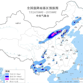 预计,7月24日08时至25日08时,内蒙古中西部偏南地区、宁夏中北部、陕西北部、山西北部、河北中北部、天津北部、北京中东部、河南东北部、四川南部和盆地西部、贵州东部和南部、湖北西南部、云南、广西西部以及青海东北部、甘肃东部、吉林中西部、黑龙江南部等地部分地区有大到暴雨,其中,内蒙古中西部偏南地区、山西北部、河北西部、北京东北部、四川盆地西南部等地局地有大暴雨(100~180毫米)。上述部分地区伴有短时强降水(最大小时降雨量20~50毫米,局地可超过70毫米),局地有雷暴大风等强对流天气。