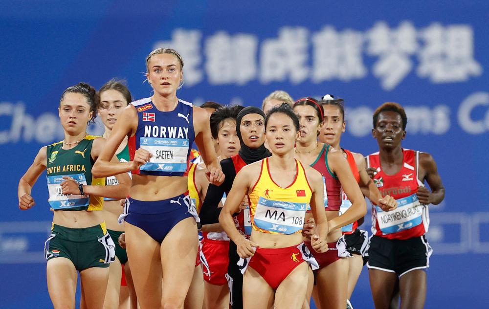 2023年8月5日,马秀针(前右)在成都大运会女子5000米决赛中,最终她获得第五名。新华社记者 贾浩成 摄