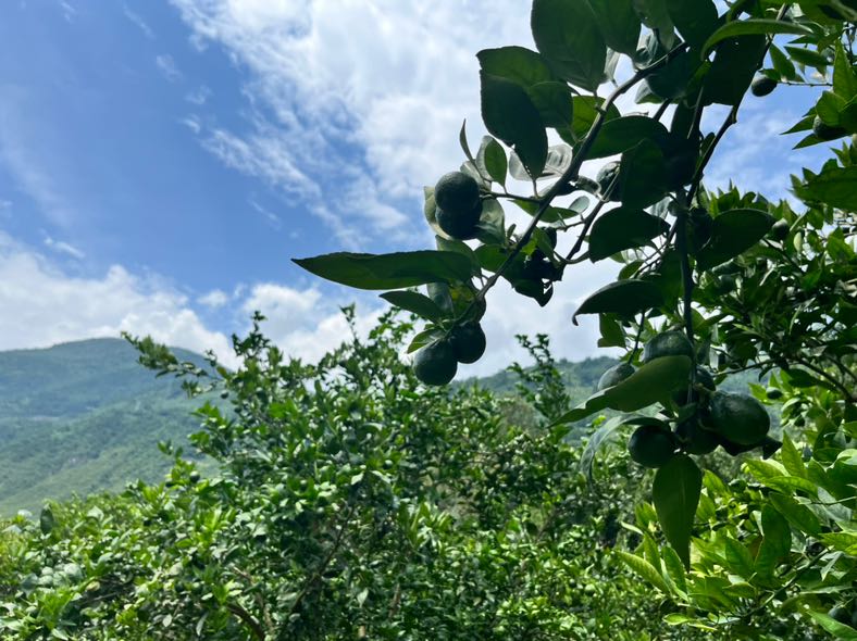 在雅安石棉县安顺场镇安顺村,采风团来到本地特产的黄果柑橘园,一个个碧绿的黄果柑如乒乓球大小,挂满枝头,亟待成熟。