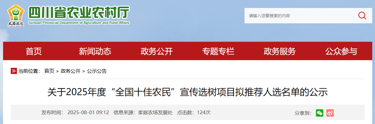 四川发布客户端消息 8月1日,四川省农业农村厅公示2025年度“全国十佳农民”宣传选树项目拟推荐人选名单,杨萍等3人拟入选。公示期为8月1日—8月7日。