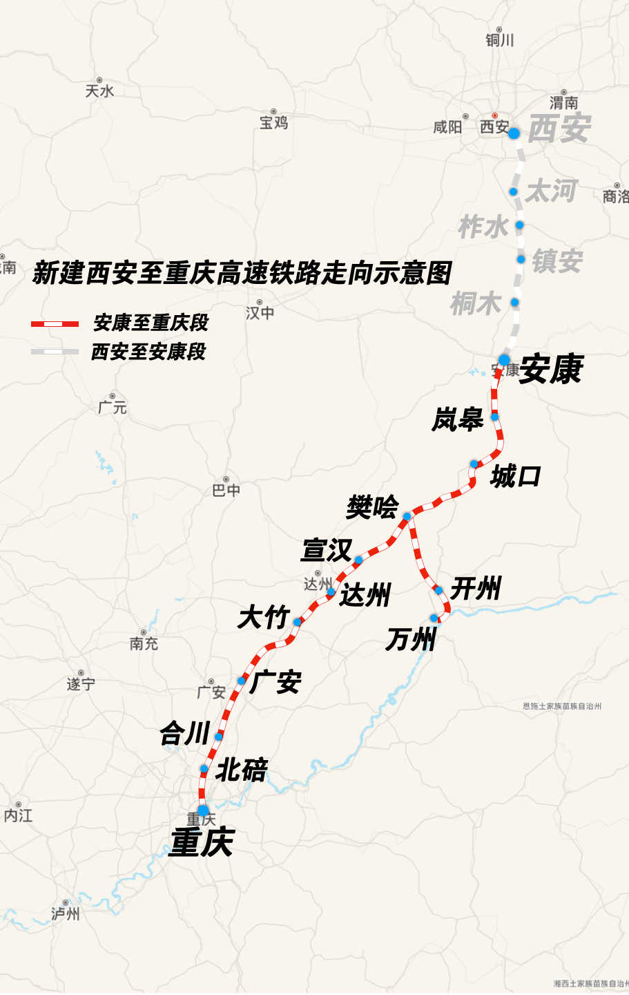 西渝高铁是我国“八纵八横”高铁网京昆通道、包(银)海通道的重要组成部分,西渝高铁康渝段正线全长478公里,线路自安康西站起,经陕西省安康市,重庆市城口县,四川省达州市、广安市,重庆市合川区、北碚区,引入重庆枢纽重庆西站。