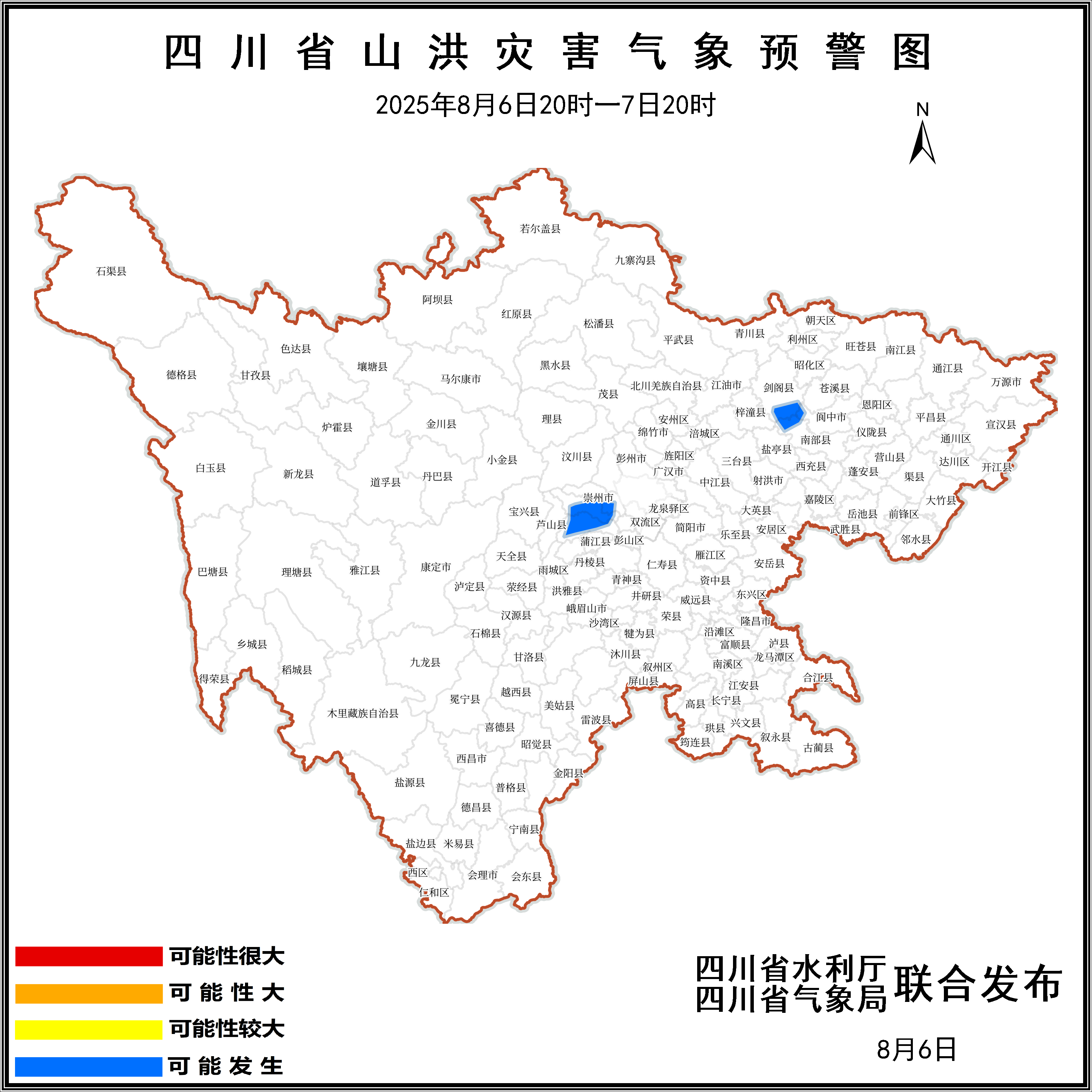 预警显示,2025年8月6日20时至7日20时,成都市邛崃、大邑、崇州,广元市剑阁,南充市阆中、南部等6个县(市、区)可能发生山洪灾害。